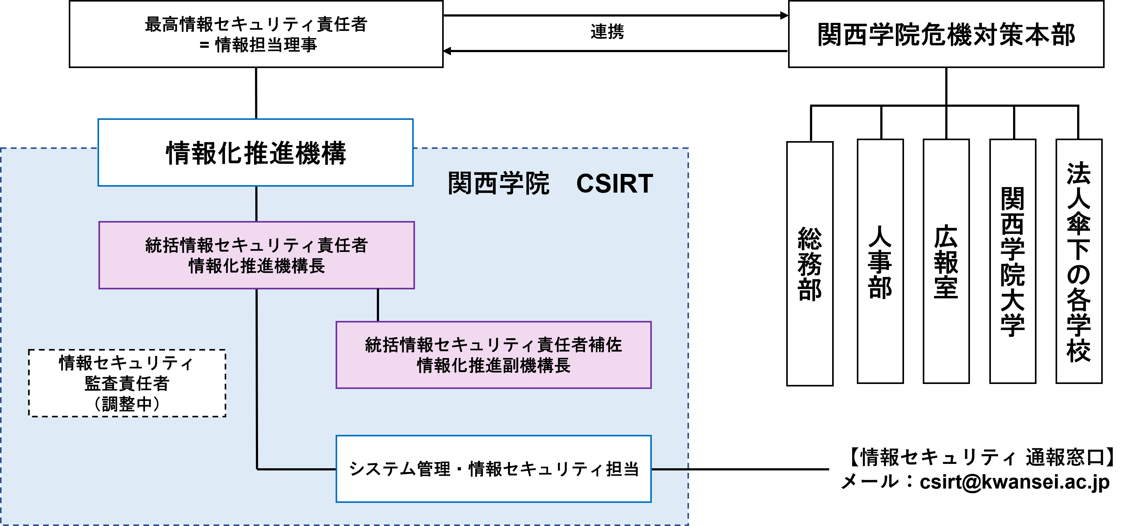 本学院では情報セキュリティ対策基準に規定される情報セキュリティインシデント対応体制として「関西学院CSIRT」を設置しています。